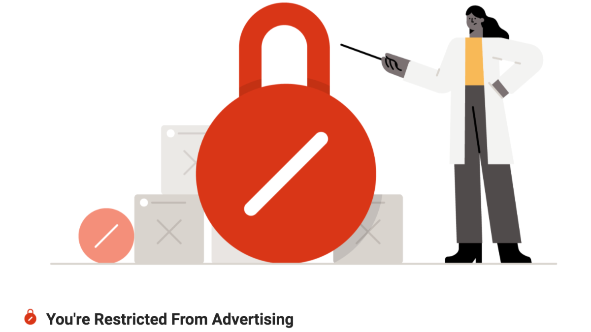 もしも、広告の管理画面を開いて制限されているようでしたら、本人確認の資料を提出して結果を待ちましょう。