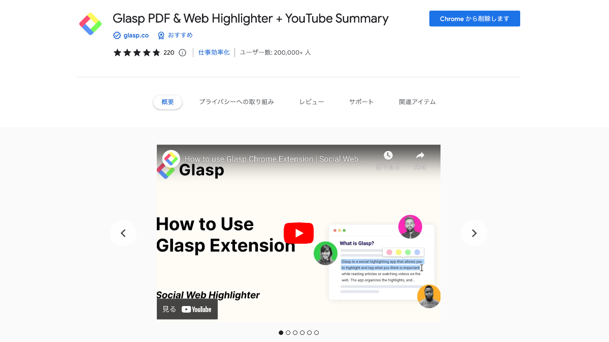 Glaspを拡張機能に入れておけば、YouTubeを開くと右側に要約するボタンが表示されます。