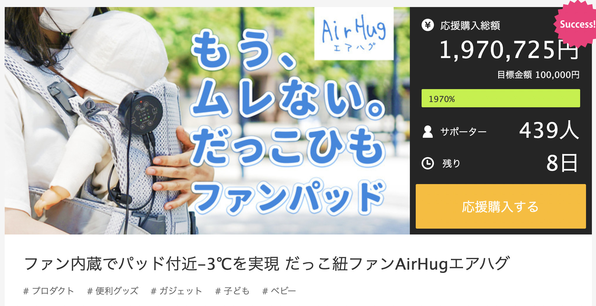既に439名の支援者に支援され197万円を達成しています。