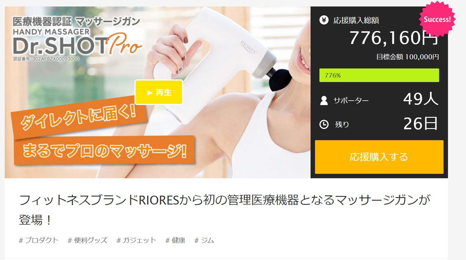 医療機器認証を取得しているため、Makuakeでも「マッサージ」という言葉を使うことができるんですね。