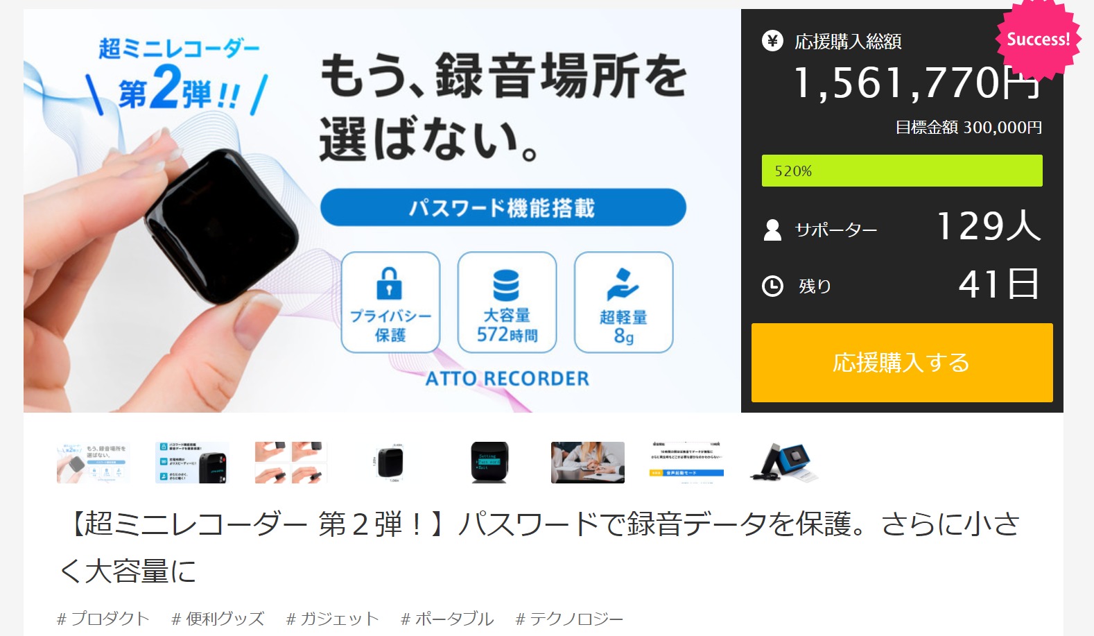 こちらは前回のクラファンキャンペーンで、1400万円以上も売り上げた超ミニレコーダー「TileRec」の第二弾です。